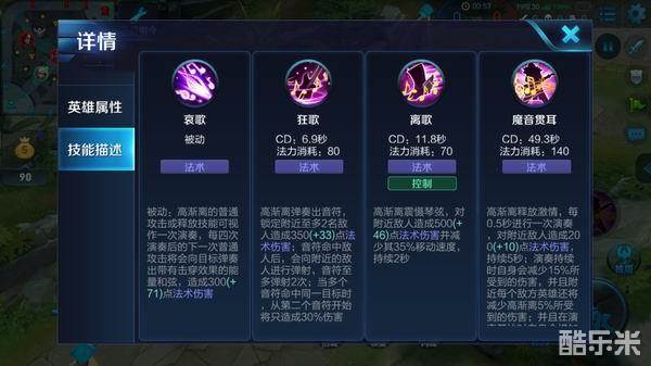 狂歌:一技能的范围比较广,音符之间可以互相弹射,是主要的伤害技能。在对线的时候可以通过一技能来压线,或者压制敌方走位,并且在团战中能起收割作用。