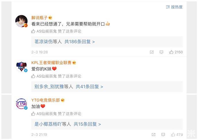 K妹和解说瓶子以及YTG战队在微博送上真挚的祝福。