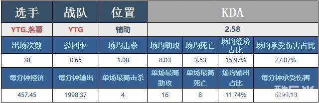 落幕在本次春季赛预选赛中代表战队出战38次,场均助攻达到8.03次,场均承受伤害占比高达27.07%。由此可以看出,落幕作为一位辅助尽职尽责,大局观强的他支援队友及时,在战局中为队友抗下大量伤害,是战队最坚实的后盾。