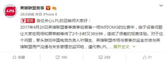 2017年4月20日英雄联盟春季赛季后赛第一场IM对OMG的比赛中,由于设备问题让大家在现场和屏幕前等待了2个小时又38分钟,造成了很差的观赛体验。对于这个问题,拳头游戏中国电竞负责人叶强生、英雄联盟市场与赛事总监金亦波与英雄联盟用户沟通与关系管理总监邓铂,谨代表LPL向所有召唤师表示诚挚歉意。