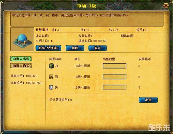 市场:平时缴获的石油、铜矿、铁矿,可以在市场卖给商人,然后换取银币。秘笈就在于,市场的等级越高,资源卖给商人的价格就越高,换取的银币就越多。所以,一定要注意提高市场的等级哦,只有这样,才能比别人赚取更多的银币。