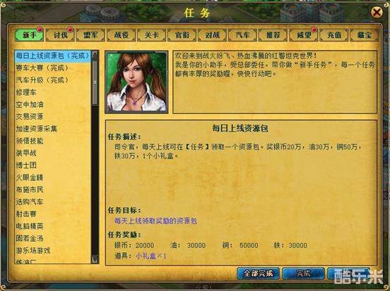 任务:初期玩家主要的资源和银币来源就是大量的任务,分别有新手,讨伐,盟军,战役,官衔等。这些任务种类繁多,奖励的银币和资源以及各种道具也都不尽相同。除了那些只能完成一次的任务外,有很多都是每日都可以反复完成的,比如讨伐,盟军,战役等。这是玩家获得资源和银币的重要途径之一。