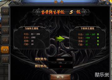 转生分为15个等级,等级越高可获得更多的各项属性加成,极大的提升角色的战斗力。 每个转生等级均有相对应的转生装备,不仅拥有比普通装备更为华丽的外形,更有着十分强大的属性。