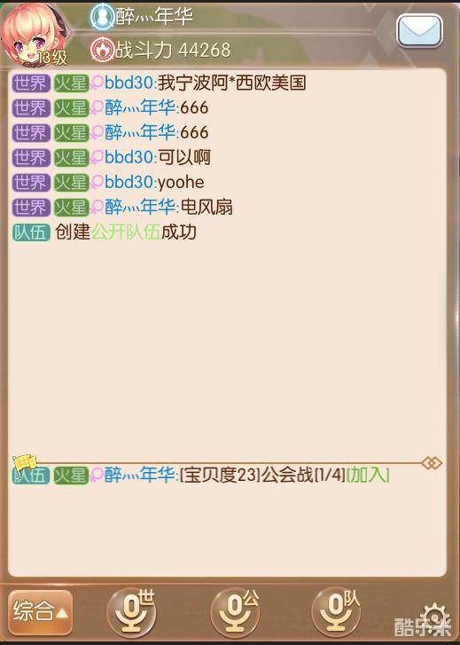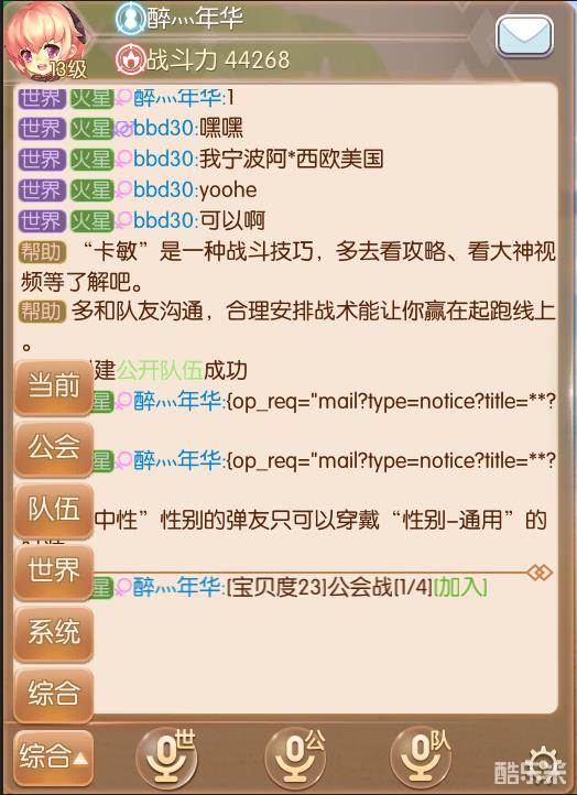 最后编辑于7年前聊天系统有综合、系统、世界、队伍、公会和当前几个频道。“综合”频道显示所有的频道信息、“系统”频道显示系统发的消息、“世界”频道显示玩家在世界中发言的信息、“队伍”频道显示玩家在队伍里发送的消息、“公会”频道显示玩家在公会里发送的消息、“当前”频道显示的是玩家在当前场景(比如主城场景、战斗场景等等)发送的消息。首页是综合频道: