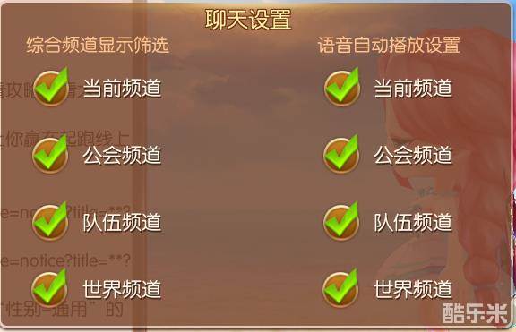 “综合频道显示筛选”表示在综合频道显示的内容,打勾则在综合频道显示。“语音自动播放设置”表示你允许哪个频道的语音自动播放,打勾则当该频道收到语音消息时自动播放,否则你需要手动点击语音信息播放。