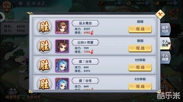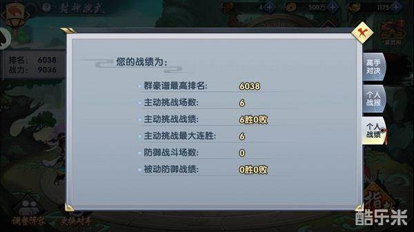 在封神演武界面,点击【战报】可通过录像对高手对决、个人战报查看精彩的战斗进行回放,同时可在个人战绩处对当前自己的挑战成绩进行查看。