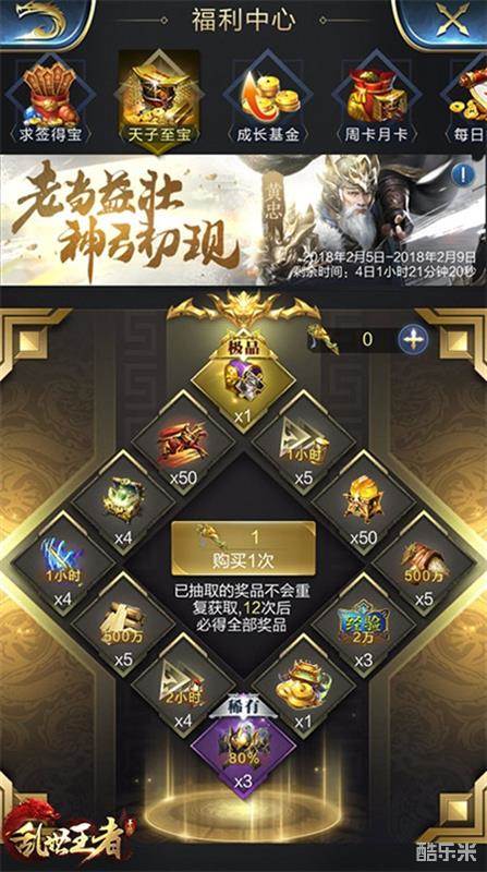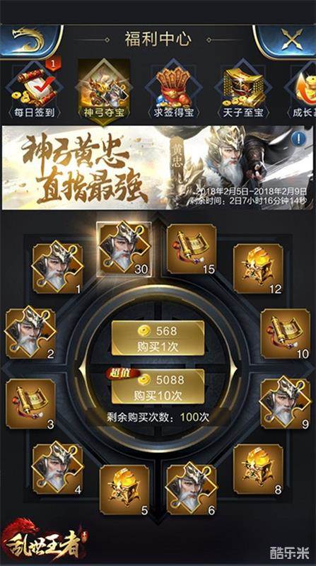 想要获得黄忠武将,主公可通过《乱世王者》手游“天子至宝”福利活动获得。该活动筹备黄忠将魂、军队扩编80%道具、500万木材等12款道具作为奖励;截止至2月9日,玩家只需拥有“天子秘钥”道具就能随机获取1款道具,100%中奖。