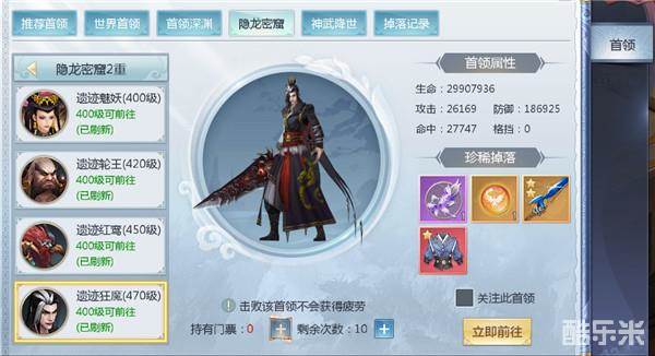2.进入隐龙密窟玩家需要拥有隐龙秘卷才可进入,每天玩家只有10次进入隐龙密窟的次数;