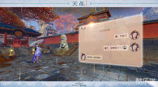 玩家的行为也是触发聊骚系统的重要因素之一。当你在对决之中战胜敌手,身为师傅的黑帝会腹黑着问你:“你又欺负别家小子了?”表面想对你谴责一番,实则正为教徒有方而窃窃暗爽。而当你漫步在金山寺的街道时,天空突然淅淅沥沥下起大雨,你甚至可以主动向NPC借伞,如果借伞对象是调皮的小青,自然免不了被她调侃一番。