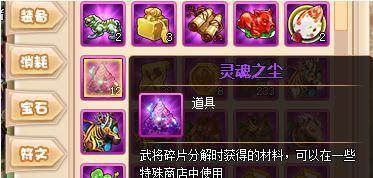 随着乐蜀三国大版本的更新,推出了新道具灵魂之尘。灵魂之尘是武将碎片分解获取的材料,可以用来兑换武将碎片。这个功能和道具都是新推出的,也是为了让玩家可以更快的集齐自己想要的碎片,从而合成武将或者给予升星。当然,多余的武将碎片或者是品质差的武将碎片可以双击兑换部分灵魂之尘,从而累积更多的灵魂之尘,兑换碎片就简单多了。