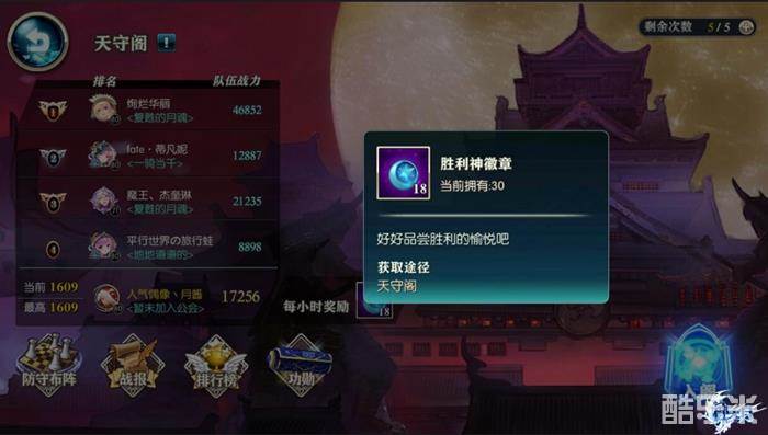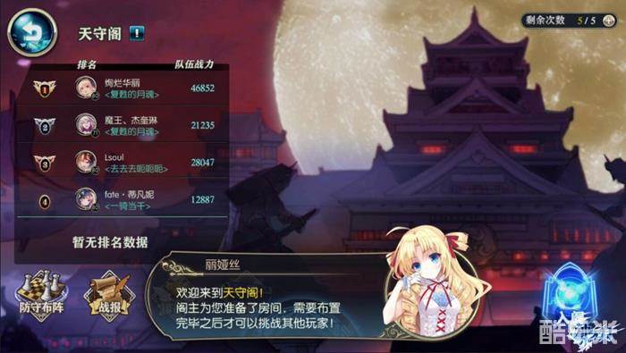 点击古兰迪娜界面中的竞技女神像即可到达天守阁的大门。穿越古色古香的门廊进入阁内就能看到天守阁争夺战的排名状况。俗话说兵马未动粮草先行,在爬塔之前,我们需要先布置好己方的阵型哦~