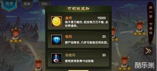 而在玩家三星通关七星坛关卡后即可获得金币钻石经验丹,新的武将。绝对是不容错过的哦!赶紧去七星坛中挑战一番吧!