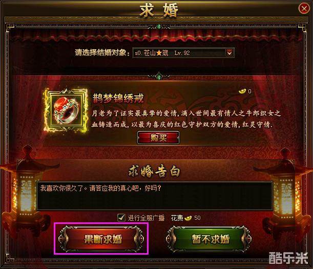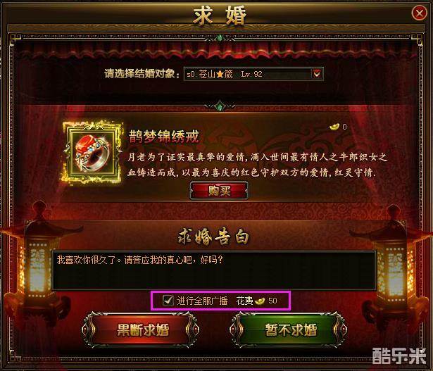 4、 为了表达你对于另一半的爱,我们特意为您设置了全服爱的公告,只需要花费50元宝,就可以让全服的玩家都感受到您对于另一半的爱,是不是很激动人心呢?