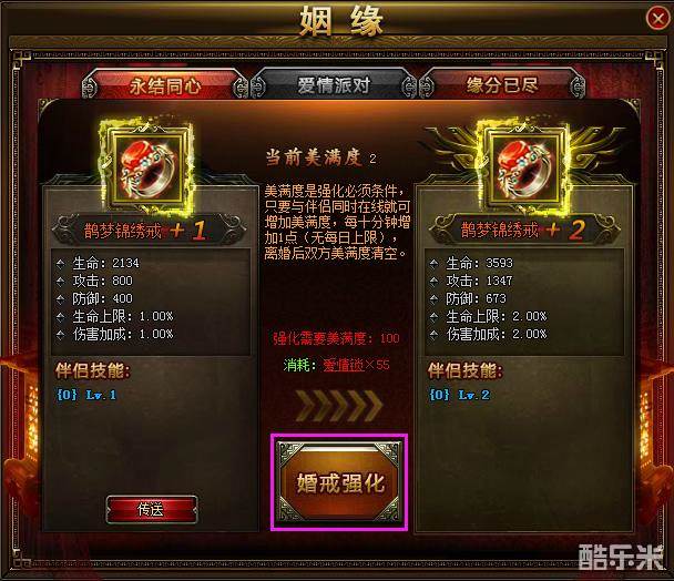 2、 玩家达到一定的美满度后还可以通过消耗道具来提升自己的婚戒属性;