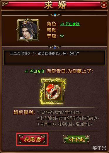 3、 求婚需要购买戒指,由求婚方购买对戒并求婚成功后,双方均会带上一枚戒指。戒指增加人物属性并附带特殊技能,既能见证你们的爱情,又能增加自身的实力,真可谓一举两得。而且最后玩家离婚与否,戒指的强化等级均会保留。