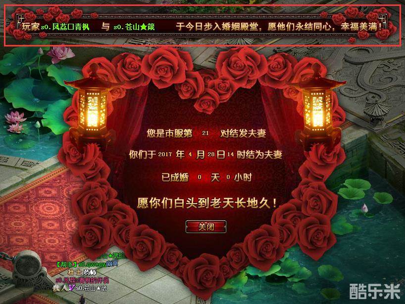 6、 若玩家点击“我愿意”,则结婚完成,玩家屏幕将会出现浪漫的玫瑰花飞舞和见证爱的全服公告,并出现成功结婚的提示哦!