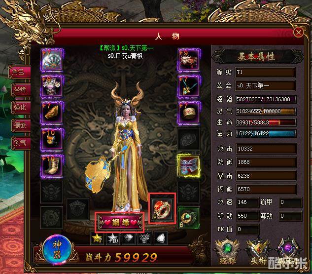 7、 成功结婚后,人物面板的“姻缘”面板处会提示您的伴侣信息以及美满度,您所购买的戒指会装备在身上。