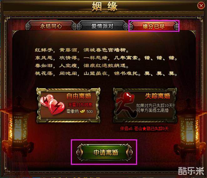1、 结婚后,玩家可点击人物面板——“姻缘”界面——“缘分已尽”