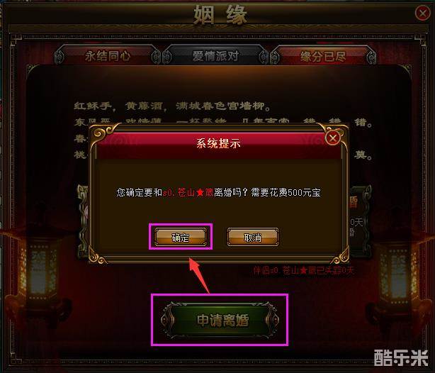 (1)、 玩家只需支付500元宝,即可单方面完成离婚过程,恢复自由之身