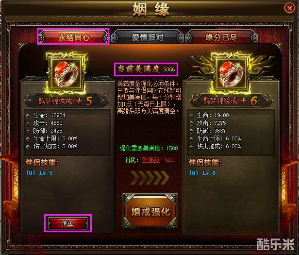 1、 结婚后,玩家可点击人物面板——“姻缘”界面——“永结同心”,点击“传送”按钮将自己传送到伴侣身边。