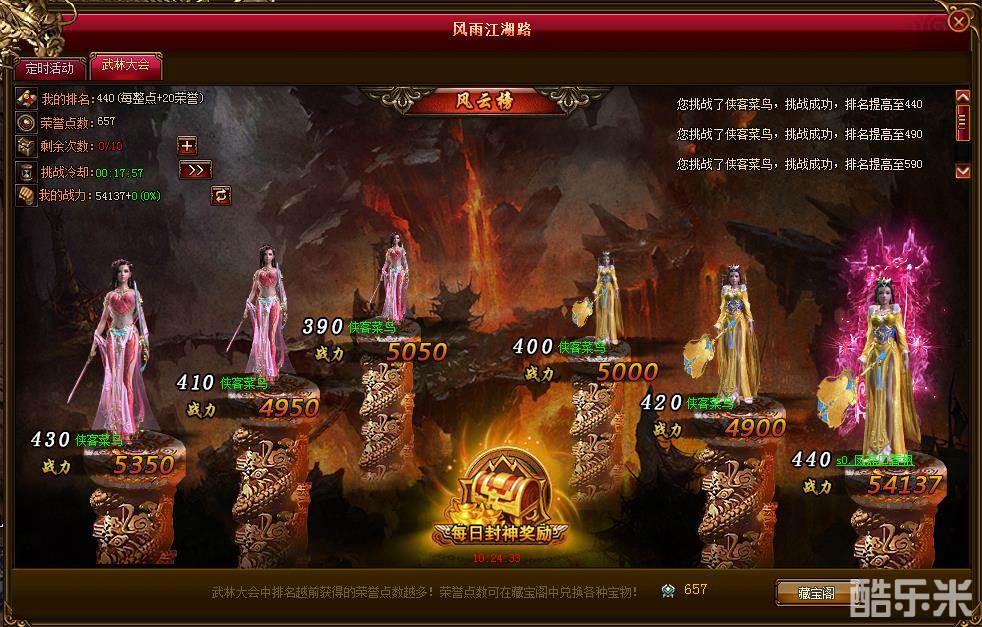 玩家可以在右上角的“风雨江湖路”按钮点击进入“武林大会”页面进行挑战,每天可以挑战10名玩家,花费元宝可以增加次数,胜利将提升排名并获得荣誉值,向江湖各界人士展示自己强大战斗的一个不错的地方。