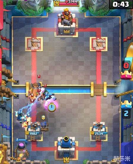 3.加农炮战车具有很强的‘射程优势’不但在对抗敌方的一些近战卡牌时能够非常针对性,当我们攻破了对手一路公主塔后,如果想要‘快速奇袭’来偷血,也可以直接在中间打出,利用射程优势和护盾保护造成较多伤害。