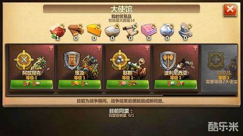 当玩家修建好大使馆之后,便出现了同盟选项,可选择不同的文明进行结盟。不同的文明有着不同的军事加成以及特色的文明兵种,使用国家贸易品可和其进行结盟。