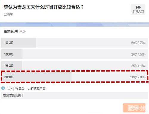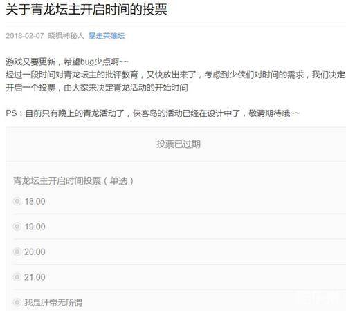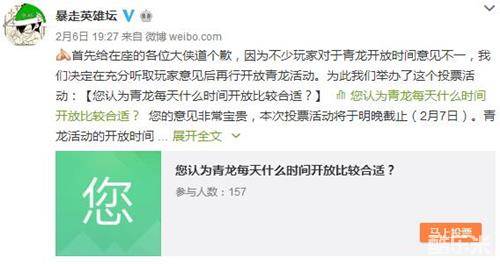 根据投票结果来看,大多数玩家都希望把活动时间调整到稍晚一些的时候;微博方面更是近乎半数投票人都赞成“20:00”这个选项。考虑到游戏群体包含大量学生党和上班族,《暴走英雄坛》技术部门将挑战青龙活动更改为每晚八点,即日起开始实行,方便更多的玩家加入战斗。