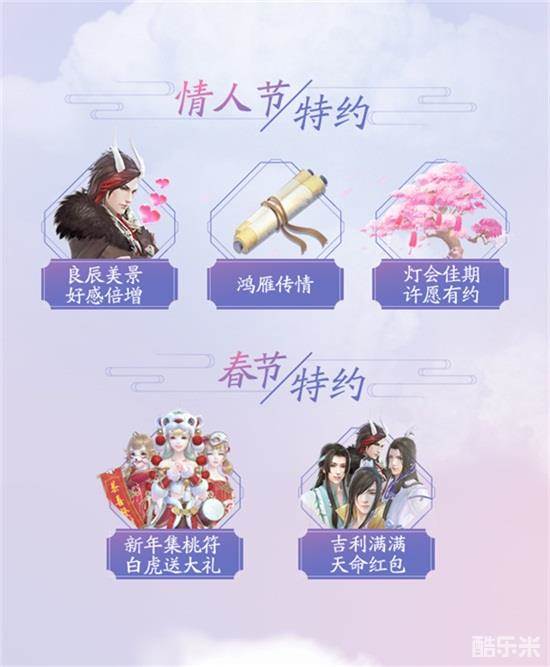 情人节正是有情人互诉衷肠的好时机,命运之子也会向《云裳羽衣》的主角倾诉衷肠。在2月6日至2月14日期间,玩家和命运之子的邀约送礼等互动都将获得双倍好感度!而情人节到来之时,还有特殊活动开放:2月12日到2月14日,玩家可以到活动页面进行许愿,许愿后可与心仪的命运之子共赴灯会,玩家们可要切记先许愿哦!当然,趁此佳节,命运之子们也会大胆表白,玩家每日都可以收到由命运之子送来的饱含爱意的书信和礼物,告诉你他们的小秘密哦!
