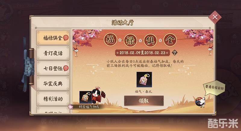 缤纷活动,共庆佳节,在全新式神与全新皮肤上线的同时,《决战!平安京》新春福利系列活动也将一并火热开启!2月9日到2月23日期间,游戏内的式神小纸人会在每日0点送出新春福气加成,受到福气加成的大人们在前三场战斗胜利后,可以获得战斗结算时掉落式神礼物、结算金币加倍、式神熟练度加倍等效果中的一项,每天都会有不同的福气哦!