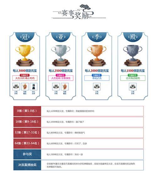 最为《诛仙手游》史上最公平3V3竞技PK赛事,决赛将于3月9日进行全明星PK赛巅峰之夜。最终获得冠军团队将获得每人3000绑定元宝以及独家专属称号“大吉大利 晚上吃鸡”,亚军将获得每人2500绑定元宝以及“人生如戏 全靠演技”专属称号,前四强还有神秘周边大奖哦!巅峰之夜同步进行全区全服官方直播,直播过程中还将进行多轮弹幕绑定元宝抽奖活动。