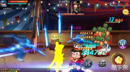 第一阶段玩家会遇到三波小丑,小丑只有一种攻击方式,那就是发射彩球。因为小丑的数量过多,小丑刚刚出现的时候,玩家应该采取退让措施!先主动往空旷的地方移动。当彩球全部被吸引之后,在利用位移技能瞬间移动到小丑所在地,然后利用群攻技能消灭小丑即可。