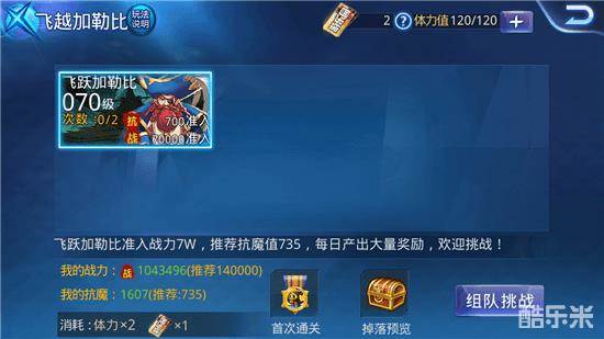天天炫斗全新副本飞越加勒比的推荐战力为70000,如果玩家想无忧通关的话,自身的抗魔值也必须要达到700,否则无法进入副本!当然了,抗魔值越高,玩家在关卡中就拥有一定的优势。玩家成功通关该副本之后就可以获取夺宝勋章,该勋章可以用来兑换称号、怪物和坐骑。