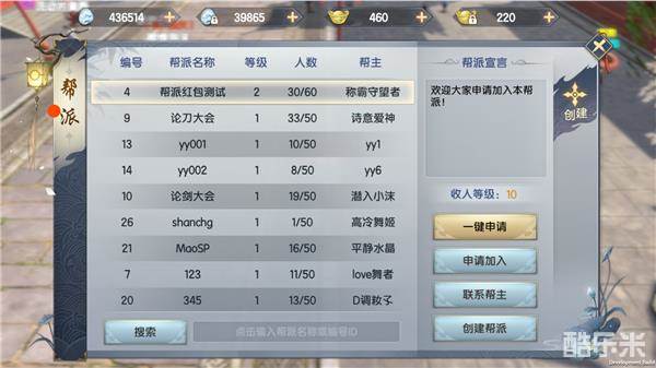 点击进入帮派界面,如果你没有心仪的帮派就可以选择一键申请,快速加入一个由系统分配的帮派,如果你有自己的目标,则在左侧列表中选中一个帮派,然后点击申请加入。如果长时间没有回应,可以在界面上找到“联系帮主”按钮给帮主发消息。