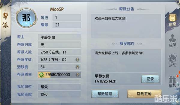帮派系统可以提高你的游戏活跃度并且获得一些福利,如玩家发的红包,帮派装备拍卖的分红等等。