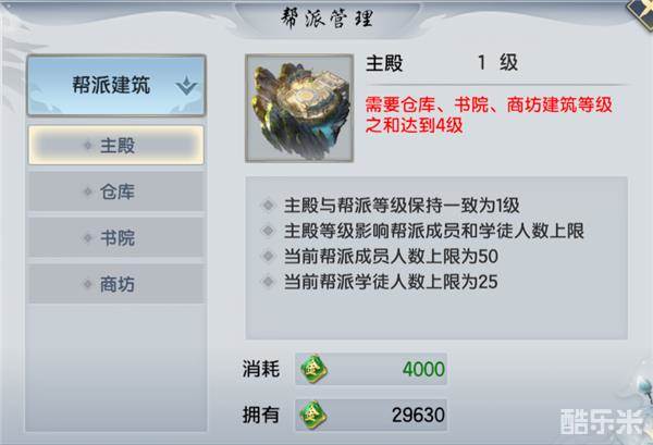 帮派管理主要是管理“主殿”,“仓库”,“书院”,“商坊”,帮派的等级就是其主殿等级,主殿需要其他建筑达到一定等级才能升级。建筑升级需要消耗家族资金。