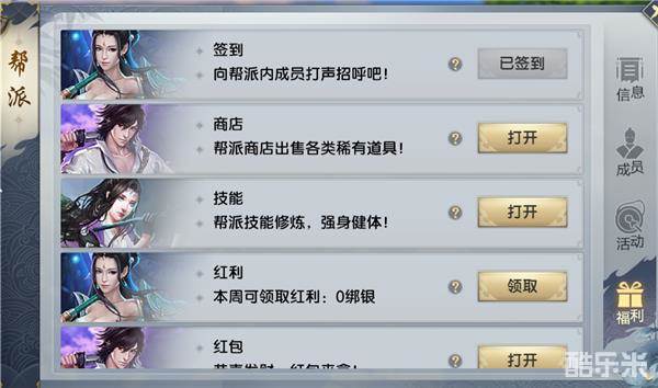 帮派福利中包含了签到奖励,超值的帮派商店,帮派技能以及红利和红包。