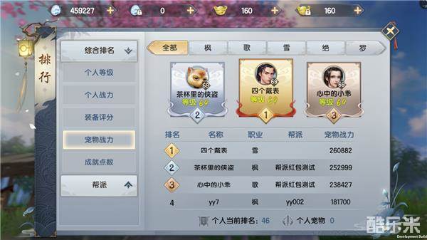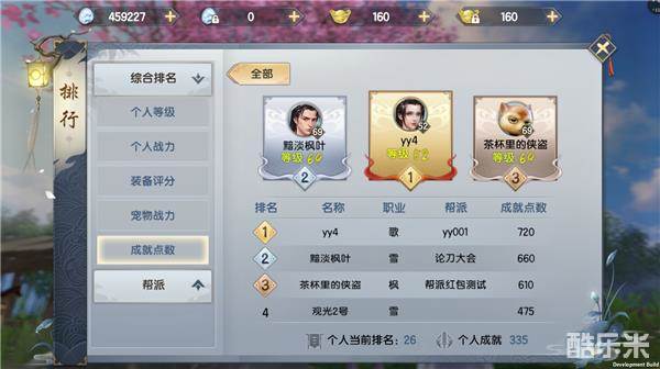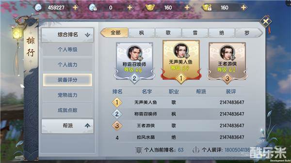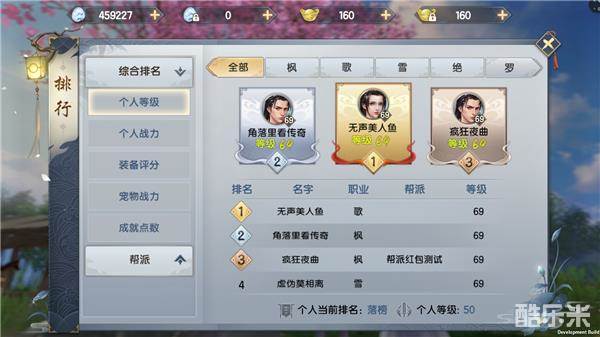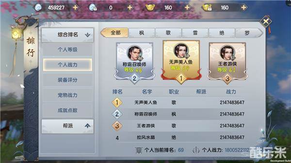 综合排名分为个人等级、个人站力、装备评分、宠物战力、成就点数五项排名。