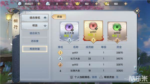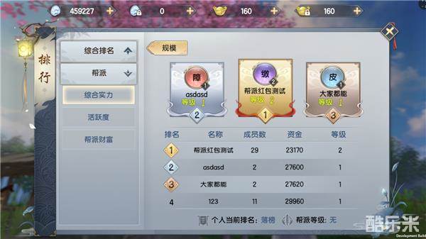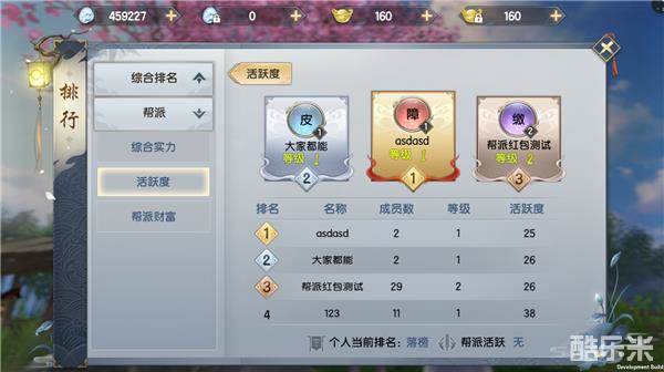 帮派排行分为综合实力、活跃度、帮派财富排行。