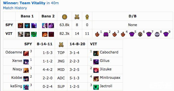 黑马VIT本场比赛再次玩起花活,ADC Minitroupax选出炸弹人和辅助Jactroll的锤石搭档下路。比赛开始后,VIT完全占据了上风,三条路全面开花,并依靠出色的运营和炸弹人的强拆在22分钟取得了1万的经济领先。SPY随后对VIT的双C进行了重点关照,但二人的出色牵制反而让SPY付出了更大的代价,让上单Cabochard可以用船长肆无忌惮的单带。在被破三路后,SPY组织了几次出色的防守,抵挡住了VIT的攻势,不过在VIT佐伊+炸弹人的高爆发组合面前,SPY最终还是难以阻止对手的强势进攻,在中单沙皇被秒后,SPY失去了防守的主要力量,最终被VIT推平了基地。VIT继续领跑积分榜。
