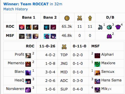 状态时好时坏的ROC对阵开赛后表现不俗的MSF,双方的阵容略显常规,而比赛在一开始也稍显平淡,ROC依靠着及时的支援在前期取得领先,17分钟,MSF中路推进但出现了配合失误,状态较差的沙皇在人群中被ROC的女警大招击杀,ROC趁势开团,打出一波0换4后将前期局势彻底掌握在自己手中。优势在手的ROC打的愈发主动,29分钟,拿下大龙的他们已然将经济差拉开到1万3。此后MSF难以招架对手的全面进攻,ROC最终用时31分钟打出了“玲珑塔”的完美比赛,同时也让MSF吞下三连败的苦果。