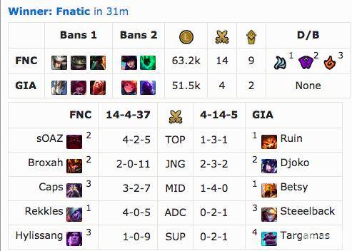 近来状态略有回暖的Fnatic对上新赛季另一支黑马Giants,FNC中单Caps本场选出卡萨丁对抗Besty的沙皇。FNC上单sOAZ在比赛开始后打出了精彩表现,奉献了对线单杀Ruin的镜头,但随即被GIA的打野Djoko疯狂针对,2分钟连续阵亡两次。此后双方陷入缠斗,经济差始终未能拉开。27分钟,双方在中路展开交火,FNC依靠打野Broxah和上单sOAZ的完美表现大获全胜,打出一波0换4后顺势拿下大龙,直接将经济拉开至1万。拿到大龙后的FNC一发不可收拾,再次打出一波0换4后,FNC干净利落的结束了比赛,本周喜获两胜。