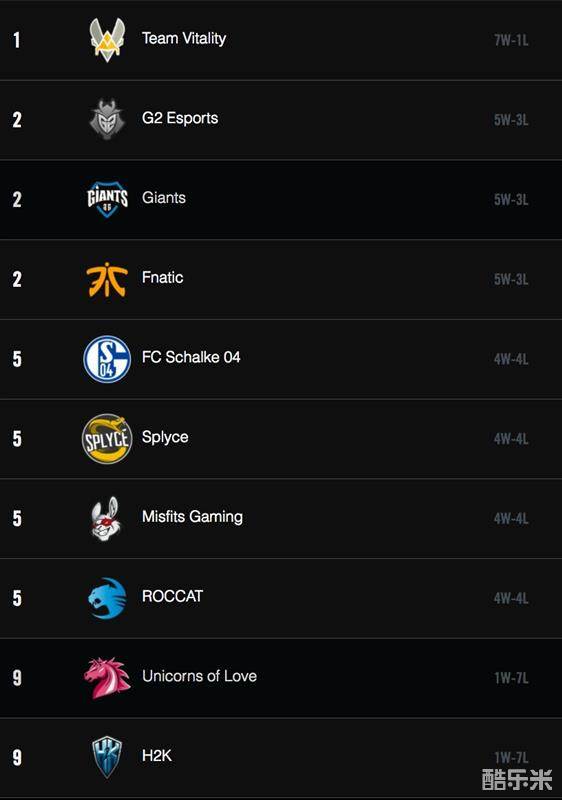 本周比赛结束后,EU LCS联赛积分榜情况为: