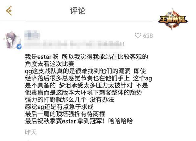 这位名为“李白”网友在“王者荣耀助手”留言道:“作为eStar粉丝从客观角度看,QGhappy是一支无懈可击的战队,AG超玩会急于求成、梦泪承受太多压力”