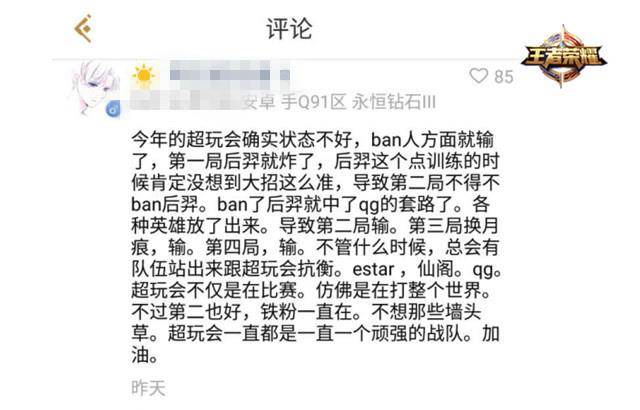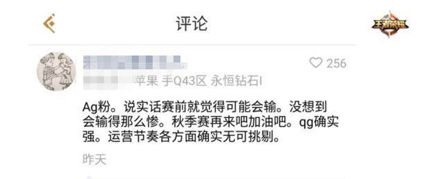 这位“未来在哪里平凡”的网友留言道:“作为AG超玩会粉丝,赛前有预感会输,希望秋季赛再来加油”