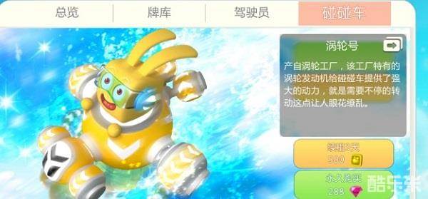 涡轮号,产自涡轮工厂,该工厂特有的涡轮发动机给碰碰车提供过来强大的动力,就是需要不停的转动这点让人眼花缭乱