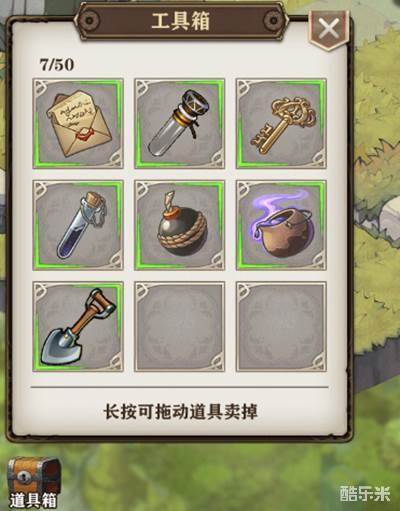 地图道具箱里会有各种类型的探索道具,帮助玩家更优地探索。其中补给瓶可以恢复补给,铲子用来产高级宝藏——土块,有耐久度。两者可以在地图中捡到,也可以在商店购买。
