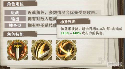 神圣连击:神圣系技能,斩击目标2~3次,每1击造成113%~143%攻击力的伤害。
