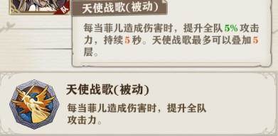 天使战歌:每当菲儿造成伤害时,提升全队5%攻击力,持续5秒。天使战歌最多可以叠加5层。