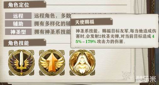 天使赐福:神圣系技能,赐福目标友军,每当他造成伤害时,会发射2枚圣光弹,对当前目标造成45%~179%攻击力伤害。